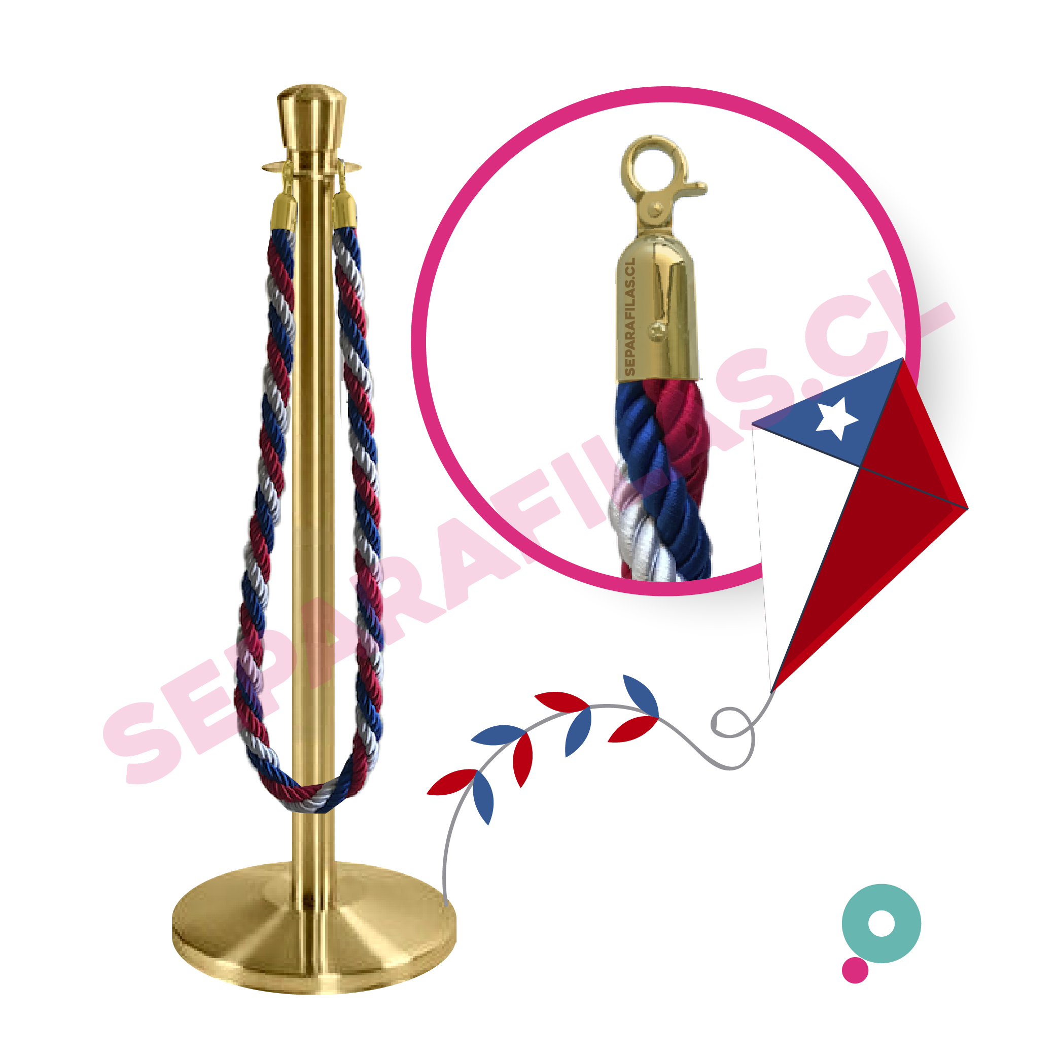 Separafilas modelo Corona Armable Poste y Base DORADA con cordón trenzado TRICOLOR y enganches dorados.