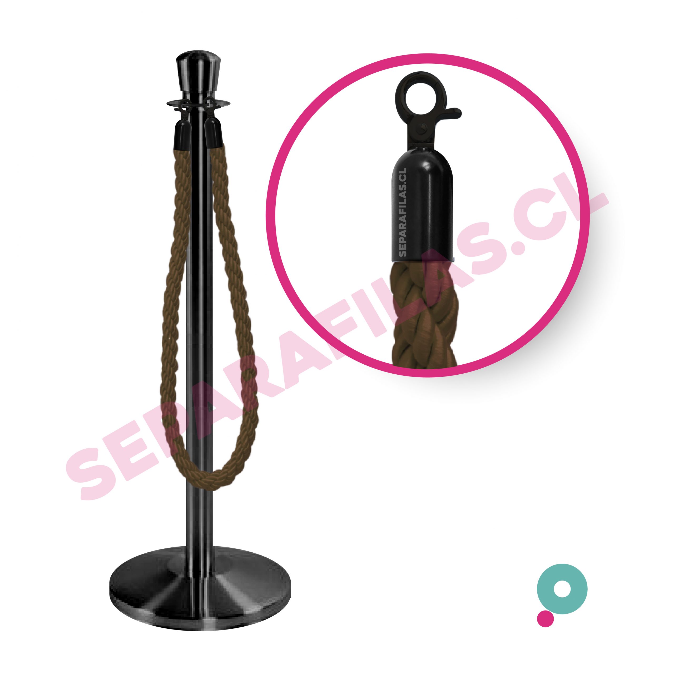 Separafilas modelo Corona armable Poste y Base NEGRA con cordón trenzado CAFÉ y enganches negros.