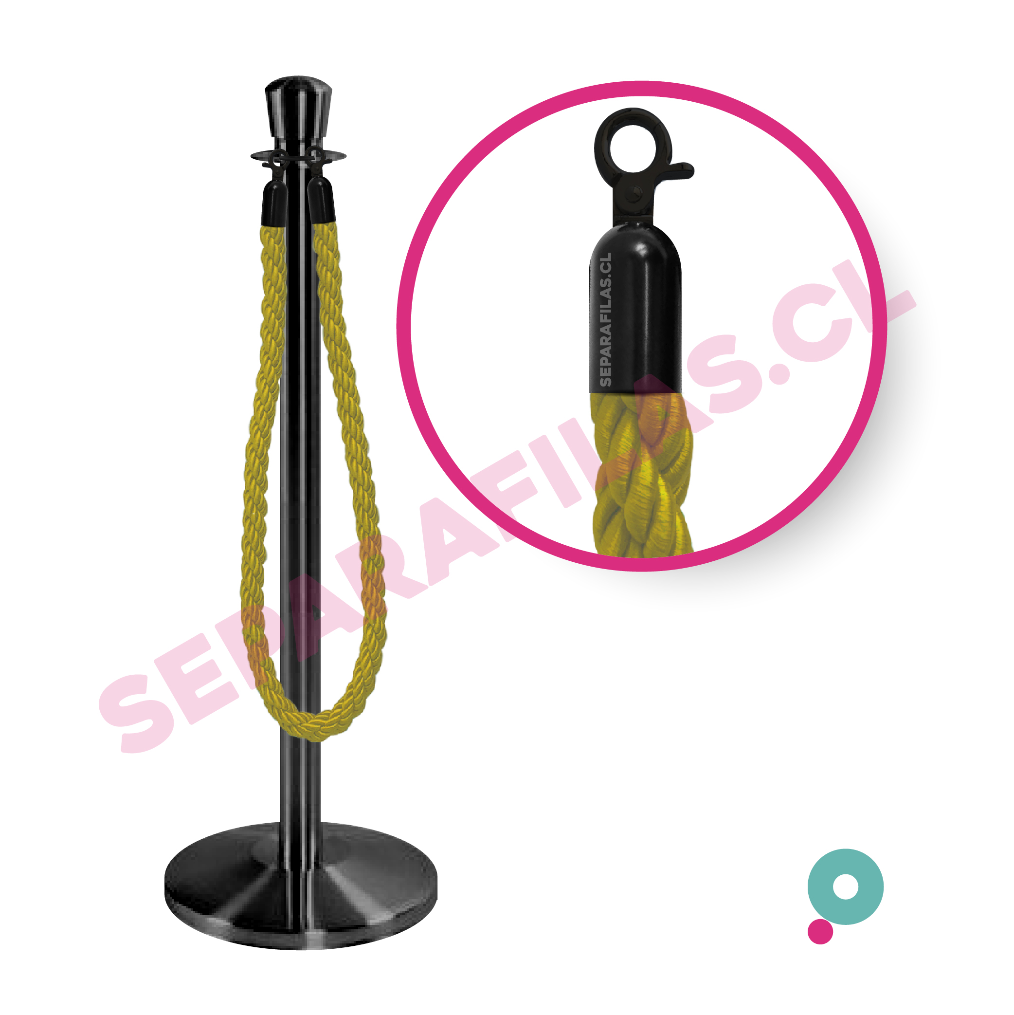 Separafilas modelo Corona Armable Poste y Base NEGRA con cordón trenzado DORADO y enganches negros.