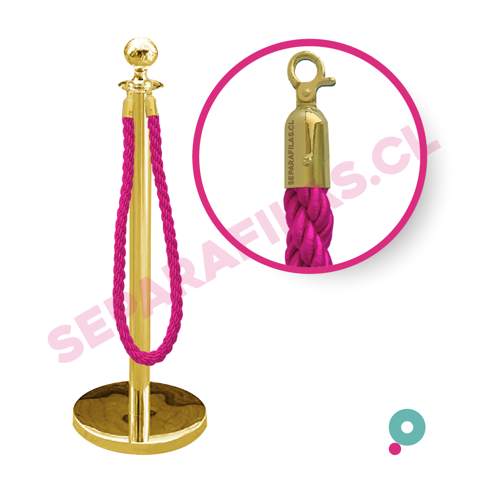Separafilas modelo Emperador Armable Poste y Base Dorado con cordón trenzado FUCSIA con enganches dorados.